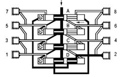 | 当活塞B位于其左侧终端位置后,它使得通向活塞C右侧终端位置的连接通道打通,这样润滑剂在压力的作用下流动并使活塞C向左运动。而位于活塞C左侧前端的润滑剂输送到排出口5。 |
