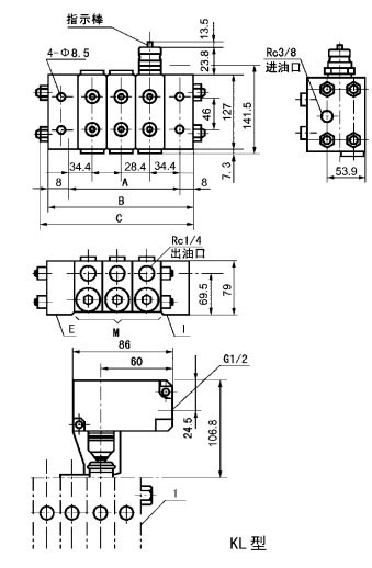 KJ、KM、KL系列单线递进式分配器,它由中碳合金结构钢制造的供给体、端部体和3~8片根据设计需要所确定的给油量和出油口数的中间体组合而成。分配器的正常出口设置于分配器的两侧面,在上面还设置有预备出口,各中间体的出油口内均装有止回阀,能彻底防止因润滑点背压作用而产生润滑脂的逆流,保证了各出油口的给油量定量、准确。