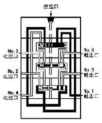 | 1、通过润滑泵加压送出的润滑剂,经供给口流入按图示箭头方向分别推动活塞A、B、C 动作。此时活塞A、B左腔在油压的作用下处在右位不动,活塞C右腔进入压力,油开始向左移动。 |