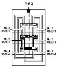 6、流入的润滑剂推动活塞B向右运动、右腔的润滑剂压向NO.5吐出口,经外部配管送向润滑点。当活塞B移动到至右极限时活塞A左腔开始进入润滑剂。
