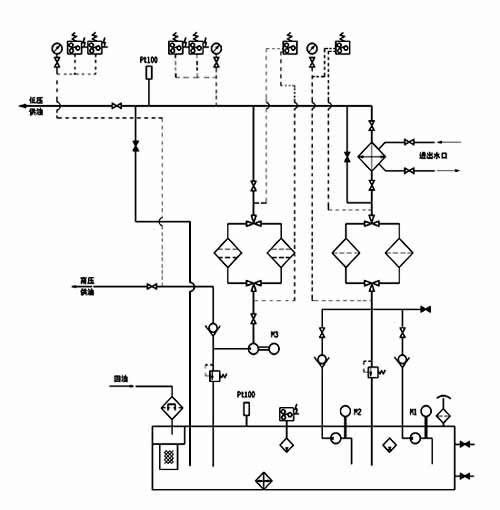 本油站为整体式,由油箱、两台低压油泵、一台高压油泵、二台双筒网片式过滤器、回油磁网过滤装置、列管式油冷却器、各种控制阀门、管道以及电接点压力表、铂热电阻等组成。