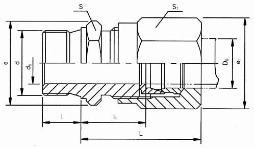 公称压力J级,管子外径D0为14mm的卡套式端对接直通管接头: