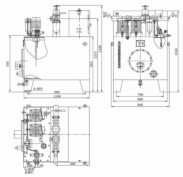 该站主要由油箱(带电加热器、液位计、电接点温度计、空气滤清器、液位控制器)、两台高压油泵装置(一备一用)、溢流阀、电磁阀、过滤器、压力控制器以及气动三联件和PLC电气控制柜等组成。在电动机的牵引下油泵工作,从油箱内吸入润滑油加压排出,途径单向阀、过滤器和三位四通电磁阀后向双线系统管线供送。正常工作时,一台高压油泵常开工作,另一台备用,可通过电气转换开关来选择使用,并可通过按钮开关人工启动和停止油泵。PLC电气控制箱对油气系统实行程序化全自动控制,还可向主控室提供系统“运行”、“停止”、“故障”等远程信号接口。